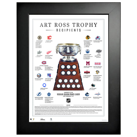 The Art Ross Trophy Print is the perfect addition to your hockey memorabilia collection, providing an image and history about the trophy and its recipients throughout the NHL's history. The print is framed by a 14” x 18” x ¾ high-quality MDF black frame with a glass front panel. The frame comes equipped with pre-mounted hooks so it is conveniently ready-to-hang. The piece ships with a protective acrylic cover to minimize breakage and increase the lifespan of your product.