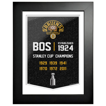 Commemorate the Boston Bruins' 100th Anniversary with this ONLINE EXCLUSIVE Centennial Empire Boston Bruins frame. The image features the Centennial logo, established year, and Stanley Cup Championship dates, all over a black backdrop. The image is complete with white faux matting. The print is framed by a 14” x 18” x ¾ high-quality MDF black frame with a glass front panel. The frame comes equipped with pre-mounted hooks so it is conveniently ready-to-hang. The piece ships with a protective acrylic cover to minimize breakage and increase the lifespan of your product. This stylish frame will add some much-needed team spirit to any room! Everyone will know that you're the most dedicated fan around when they catch a glimpse of this stunning piece!