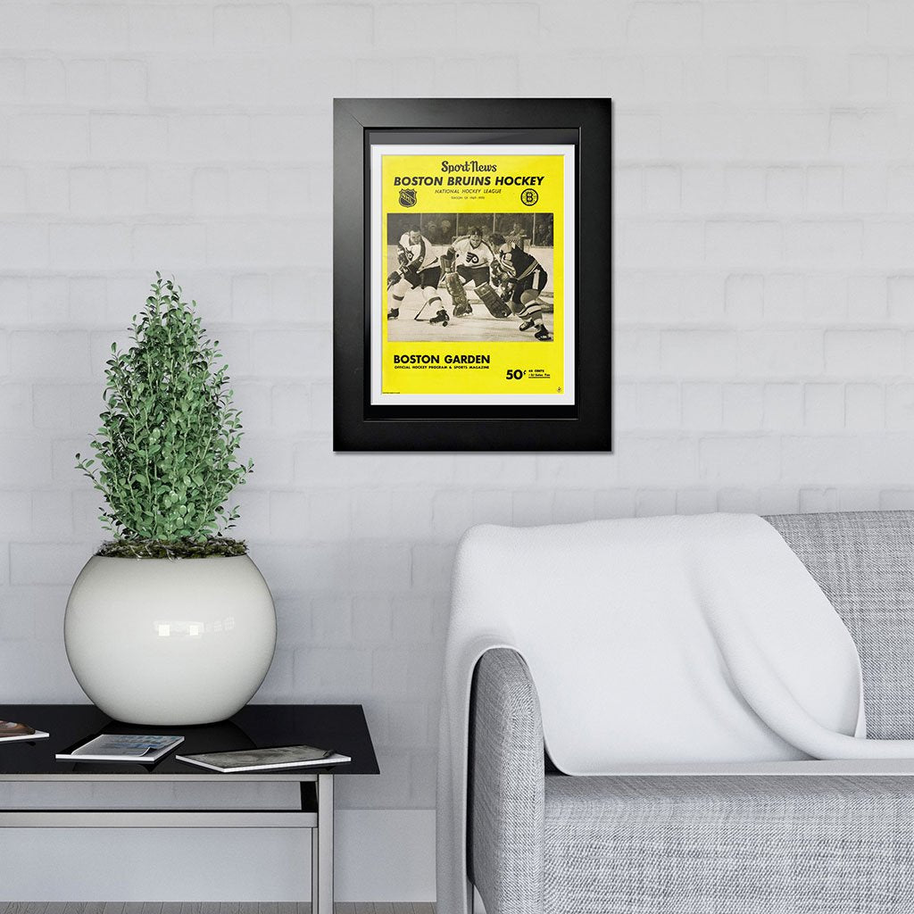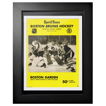 In the early days, long before cell phones and social media, hockey fans would arrive at their arena anxious to buy the latest game program giving them the latest info they needed to follow their favorite team. The advent of digital design and sophisticated photography has dramatically transformed the look and feel of the classic game-night program that captured the attention of fans. As early as the 1920’s, portraits and caricatures captured the scope of what fans would find at the rink. A unique black and white photo of action against rival Flyers graces This truly vintage 1969 Sport News Boston Garden program cover features John McKenzie (Bruins), Bernie Parent and Ed Van Impe (Flyers).