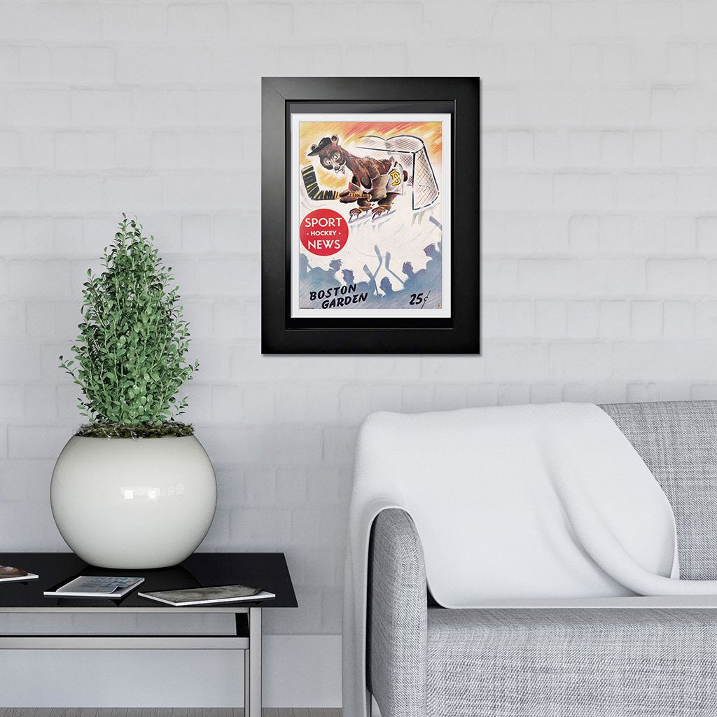 In the early days, long before cell phones and social media, hockey fans would arrive at their arena anxious to buy the latest game program giving them the latest info they needed to follow their favorite team. The advent of digital design and sophisticated photography has dramatically transformed the look and feel of the classic game-night program that captured the attention of fans. As early as the 1920’s, portraits and caricatures captured the scope of what fans would find at the rink. A cartoon bear blocking the net adorns the cover of this truly vintage Sport News Boston Garden program cover that was published in 1949.