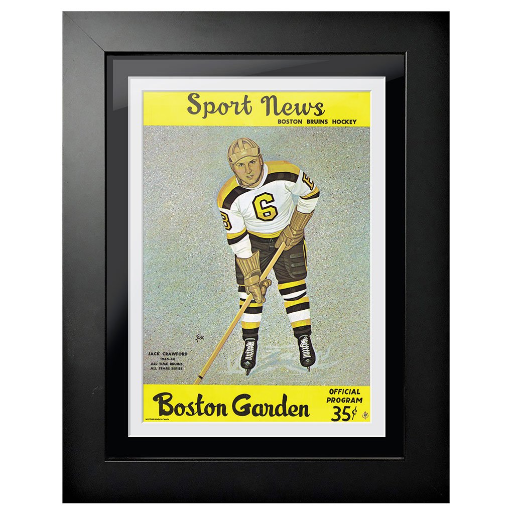 In the early days, long before cell phones and social media, hockey fans would arrive at their arena anxious to buy the latest game program giving them the latest info they needed to follow their favorite team. The advent of digital design and sophisticated photography has dramatically transformed the look and feel of the classic game-night program that captured the attention of fans. As early as the 1920’s, portraits and caricatures captured the scope of what fans would find at the rink. A classic Sport News Boston Garden program cover featuring an illustration of Jack Crawford who was a defenseman and coach with the Boston Bruins. Despite Crawford's preference to be called "Johnny" or "John", the media often referred to him as "Jack". Crawford started his National Hockey League career with the Boston Bruins in 1938.