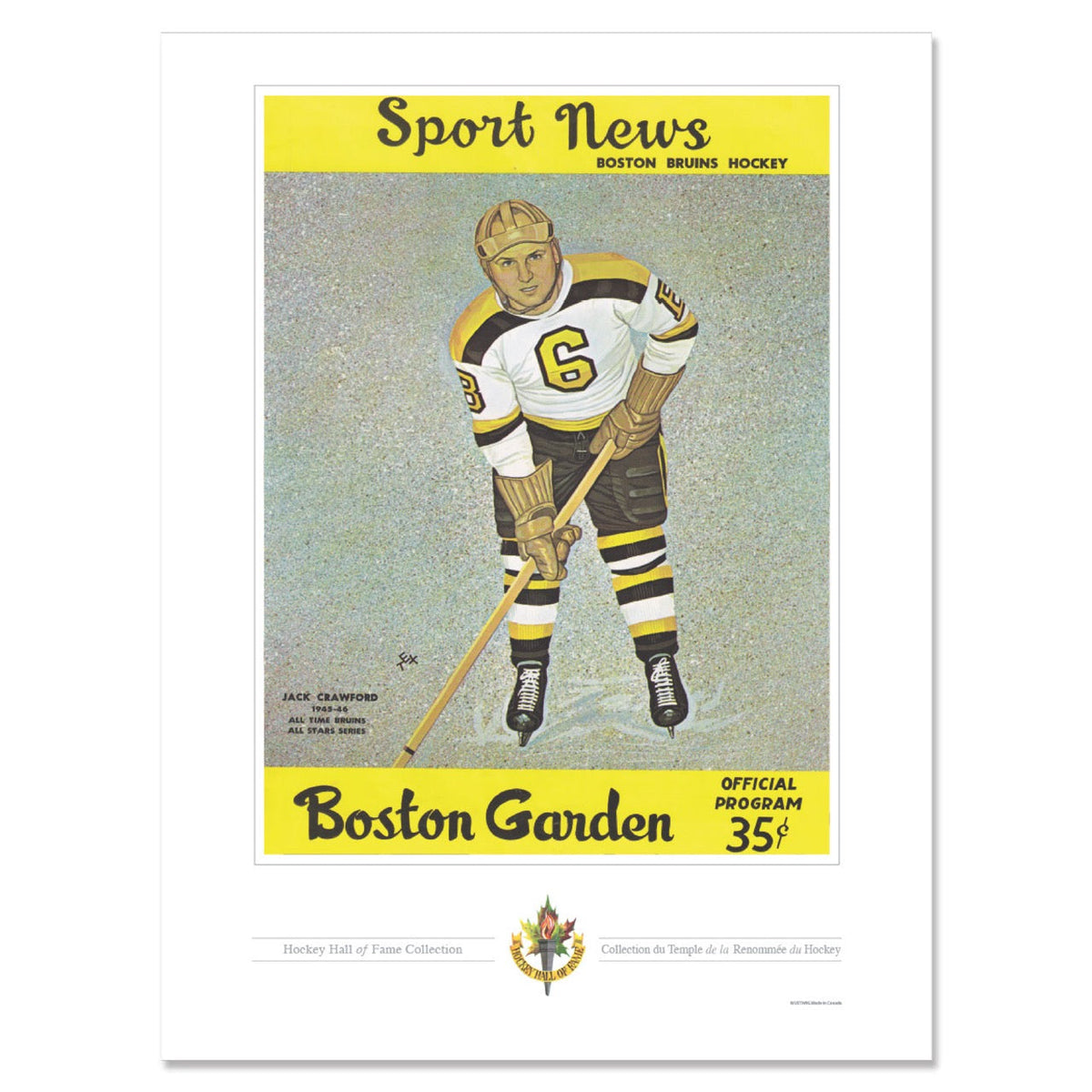 In the early days, long before cell phones and social media, hockey fans would arrive at their arena anxious to buy the latest game program giving them the latest info they needed to follow their favorite team. The advent of digital design and sophisticated photography has dramatically transformed the look and feel of the classic game-night program that captured the attention of fans. As early as the 1920’s, portraits and caricatures captured the scope of what fans would find at the rink. A classic Sport News Boston Garden program cover featuring an illustration of Jack Crawford who was a defenseman and coach with the Boston Bruins. Despite Crawford's preference to be called "Johnny" or "John", the media often referred to him as "Jack". Crawford started his National Hockey League career with the Boston Bruins in 1938.