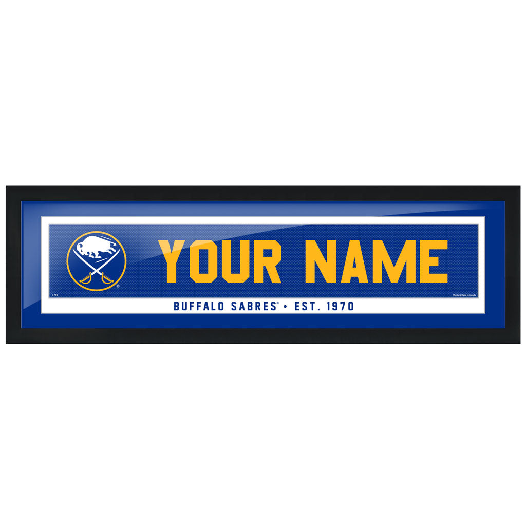 The perfect addition to any hockey Fan Cave, Man Cave, office or bar. This personalized Buffalo Sabres wall art includes one of our officially licensed NHL graphics, printed and placed into our 6” x 22” framed art kits by our Canadian production team. This fine piece of wall-décor ships with a protective acrylic cover to minimize breakage and increase the lifespan of your product. All framed home décor comes with pre-mounted hanging hardware. Additional mounting hardware may be required.