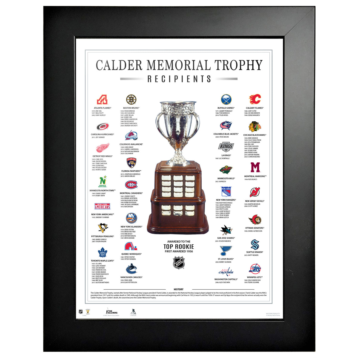 The Calder Memorial Trophy Frame is the perfect addition to your hockey memorabilia collection, providing an image and history about the trophy and its recipients throughout the NHL's history. The print is framed by a 14” x 18” x ¾ high-quality MDF black frame with a glass front panel. The frame comes equipped with pre-mounted hooks so it is conveniently ready-to-hang. The piece ships with a protective acrylic cover to minimize breakage and increase the lifespan of your product.