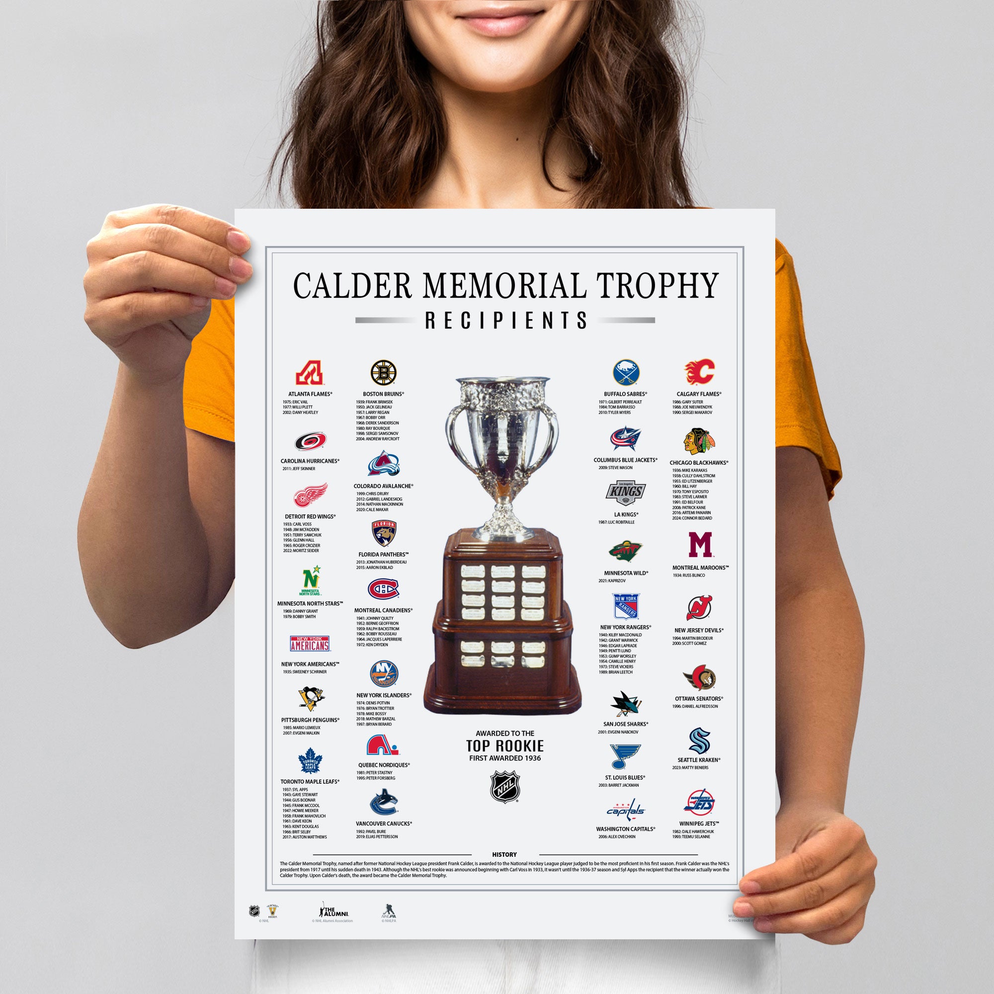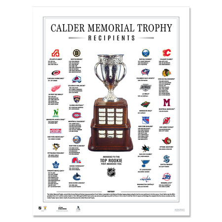 The Calder Memorial Trophy Print is the perfect addition to your hockey memorabilia collection, providing an image and history about the trophy and its recipients throughout the NHL's history. The image is printed on 12” x 16” poster paper and comes in a cardboard tube, making it easily transportable. Use the print as a solo item, or to fill an empty frame.