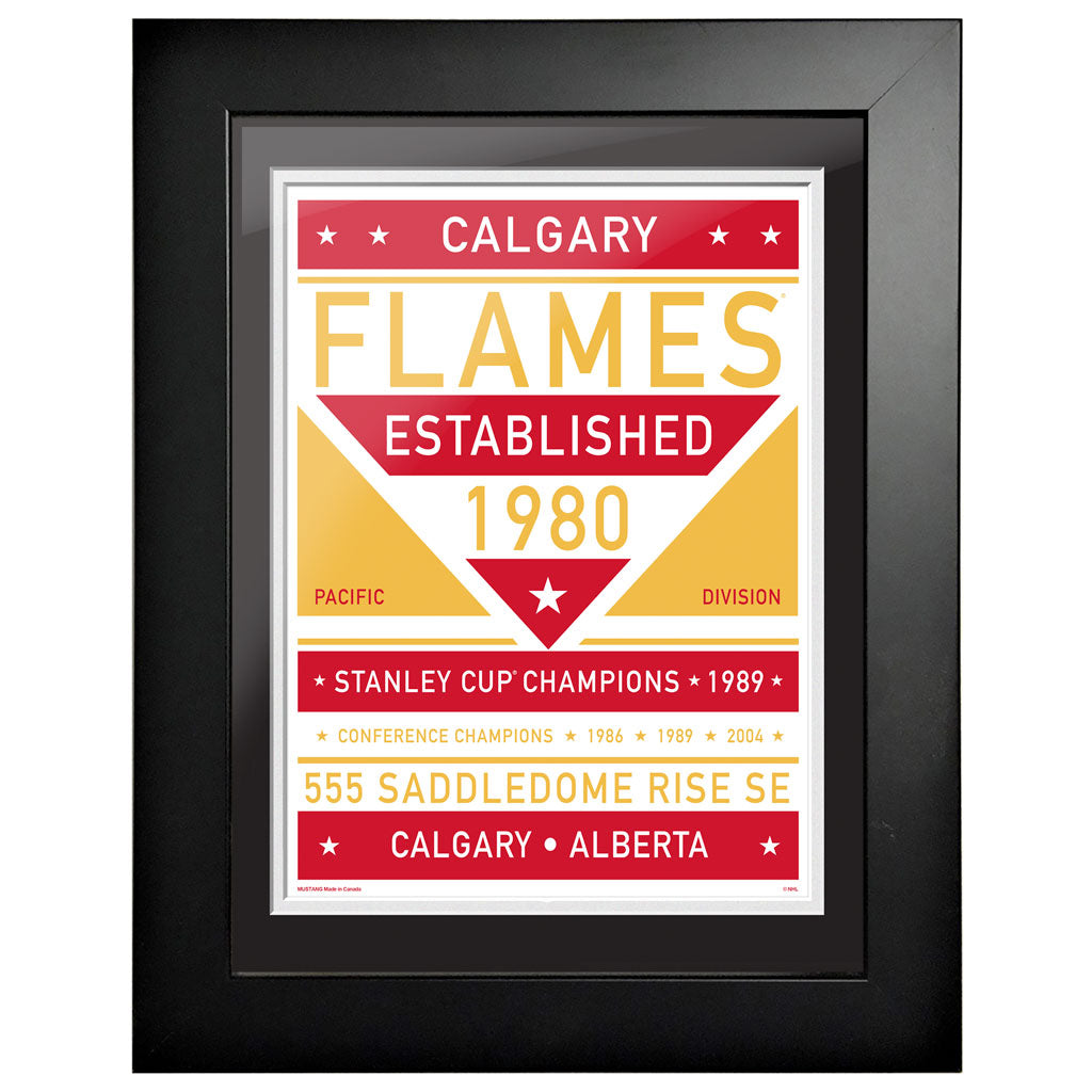The perfect addition to any hockey Fan Cave, Man Cave, office or bar. This Calgary Flames wall art includes one of our officially licensed NHL graphics, printed and placed into our 12” x 16” framed art kits by our Canadian production team. This fine piece of wall-décor ships with a protective acrylic cover to minimize breakage and increase the lifespan of your product. All framed home décor comes with pre-mounted hanging hardware. Additional mounting hardware may be required.