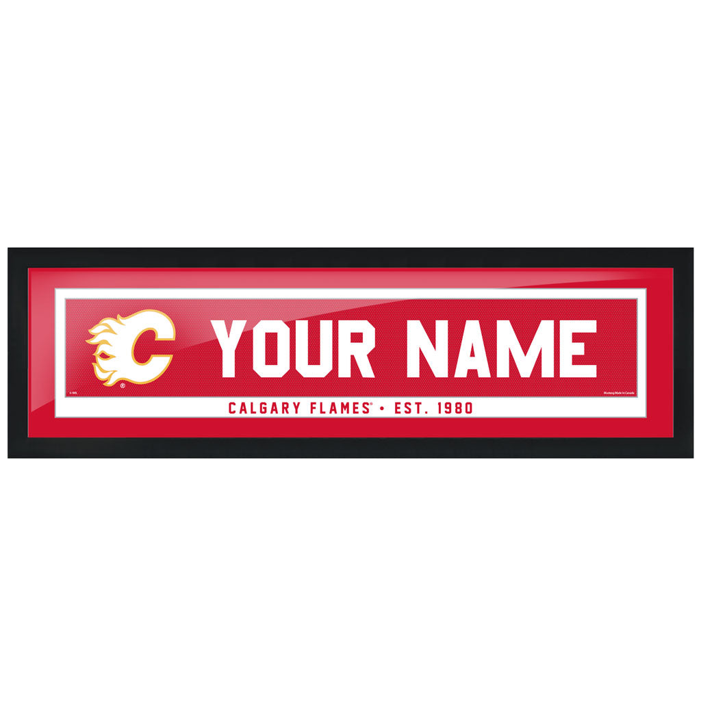 The perfect addition to any hockey Fan Cave, Man Cave, office or bar. This personalized Calgary Flames wall art includes one of our officially licensed NHL graphics, printed and placed into our 6” x 22” framed art kits by our Canadian production team. This fine piece of wall-décor ships with a protective acrylic cover to minimize breakage and increase the lifespan of your product. All framed home décor comes with pre-mounted hanging hardware. Additional mounting hardware may be required.