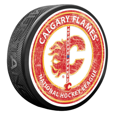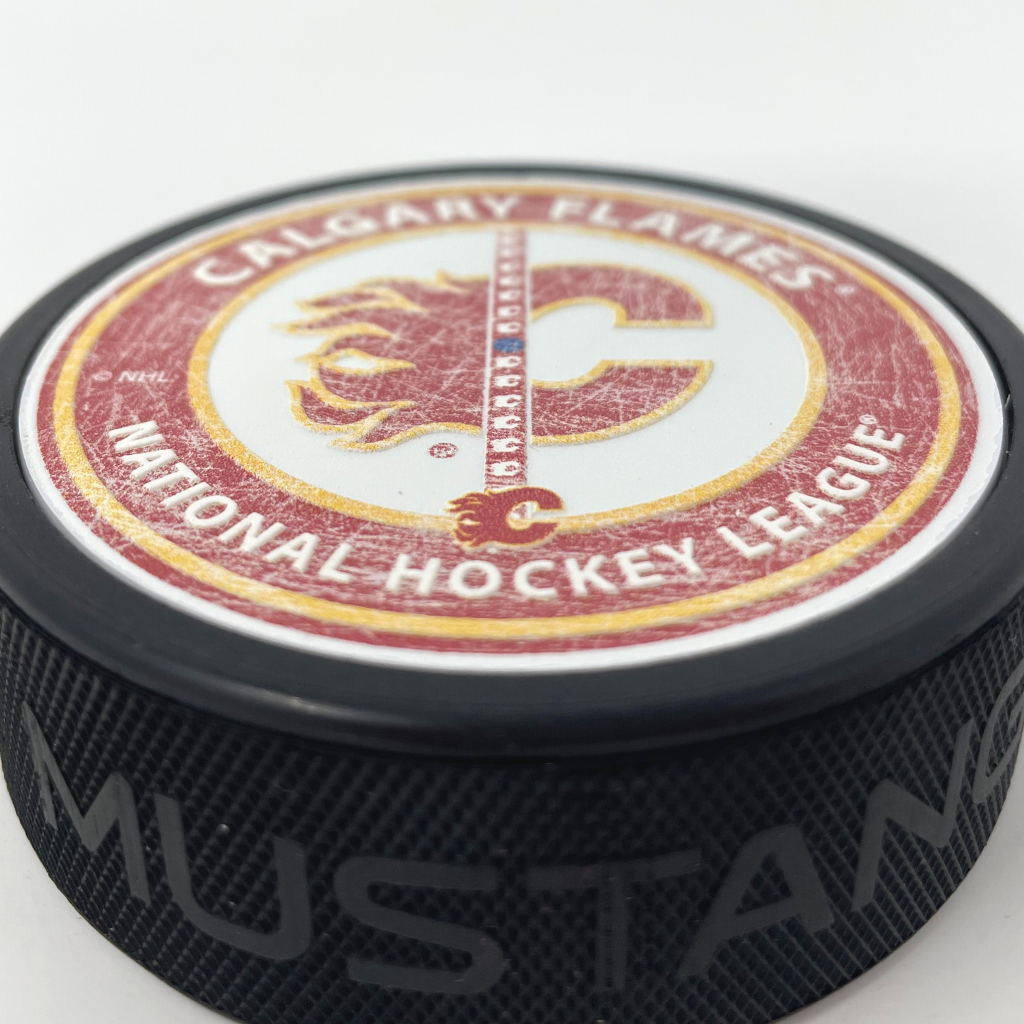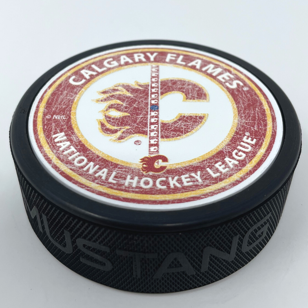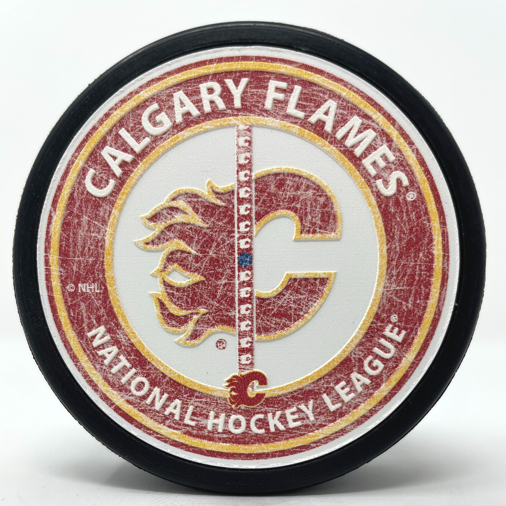 This unique Center Ice Calgary Flames Puck is designed with the Flames center ice logo. Look closely and you will see the red line representing center ice. The 3D engraving adds texture that you won’t find with just a regular printed puck, making this a stand-out in your collection!