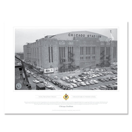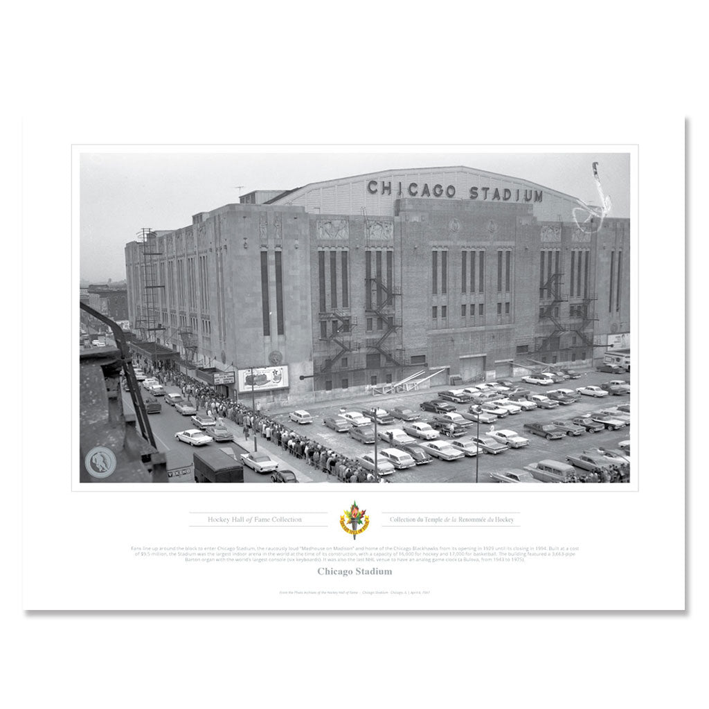 Fans line up around the block to enter Chicago Stadium, the raucously loud “Madhouse on Madison” and home of the Chicago Blackhawks from its opening in 1929 until its closing in 1994. Built at a cost of $9.5 million, the Stadium was the largest indoor arena in the world at the time of its construction, with a capacity of 16,000 for hockey and 17,000 for basketball. The building featured a 3,663-pipe Barton organ with the world’s largest console (six keyboards). It was also the last NHL venue to have an analog game clock (a Bulova, from 1943 to 1975).