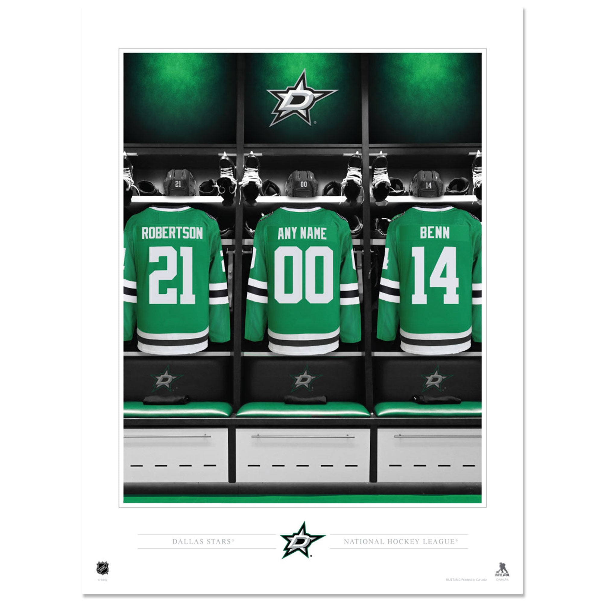 The print features Robertson and Benn jerseys hanging in the Stars locker room, on either side of a custom jersey. Make the piece your own by personalizing the jersey with any name and number. The base of the print includes the team name, logo, and league name. Printed on a textured archival paper, this piece is perfect as a solo item, or to fill an empty frame.