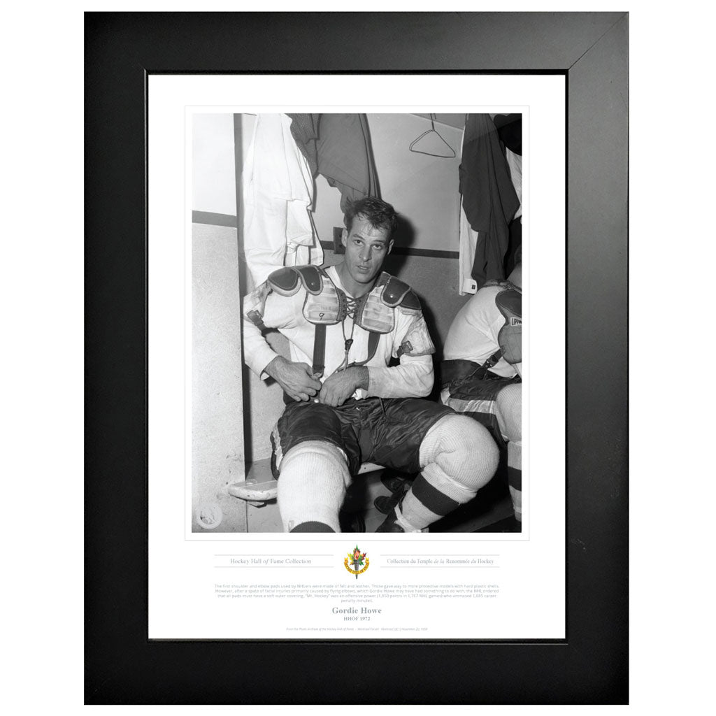 The first shoulder and elbow pads used by NHLers were made of felt and leather. Those gave way to more protective models with hard plastic shells. However, after a spate of facial injuries primarily caused by flying elbows, which Gordie Howe may have had something to do with, the NHL ordered that all pads must have a soft outer covering. “Mr. Hockey” was an offensive power (1,850 points in 1,767 NHL games) who
