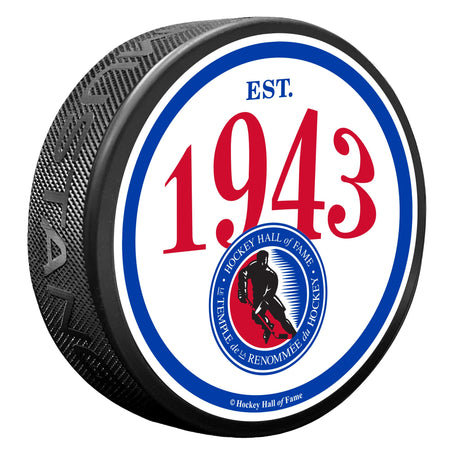 The puck features a backdrop of the HHOF brand colors, accompanied by the Hall's logo and date of establishment. The 3D engraving adds texture that you won’t find with just a regular printed puck, making this a stand-out in your collection!