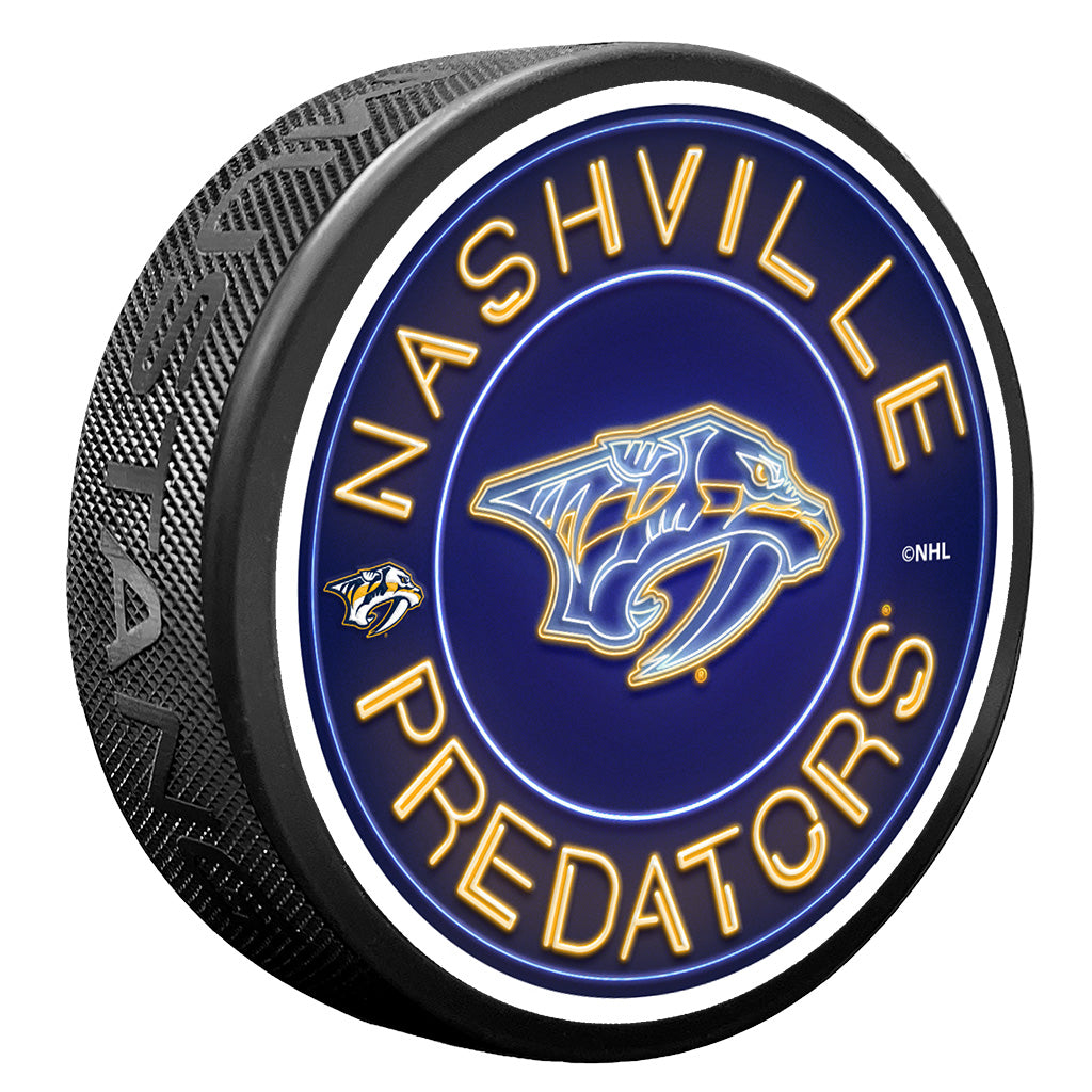 Electrified with a glowing neon finish, this puck features the team’s name and logo on a dark backdrop, creating a vibrant design that glows bright like the arena lights. The 3D engraving adds texture that you won’t find with just a regular printed puck, making this a stand-out in your collection!