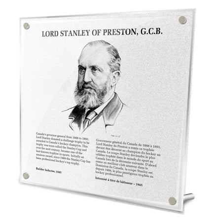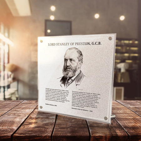 This black & white acrylic plaque features a hand-drawn photo of Lord Stanley and background history in both English and French. Four chrome-plated pins add both style and function, holding the piece up to display on a table-top. The piece comes in a protective presentation box to minimize breakage and increase the lifespan of your product.