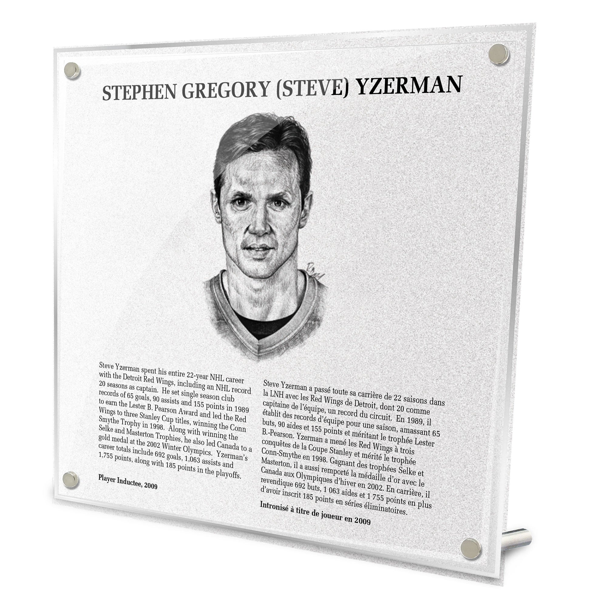 This black & white acrylic plaque features a hand-drawn photo of Yzerman and background history in both English and French. Four chrome-plated pins add both style and function, holding the piece up to display on a table-top. The piece comes in a protective presentation box to minimize breakage and increase the lifespan of your product.