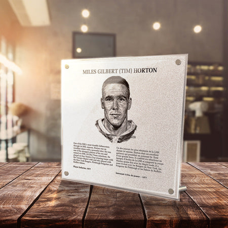 This black & white acrylic plaque features a hand-drawn photo of Horton and background history in both English and French. Four chrome-plated pins add both style and function, holding the piece up to display on a table-top. The piece comes in a protective presentation box to minimize breakage and increase the lifespan of your product.
