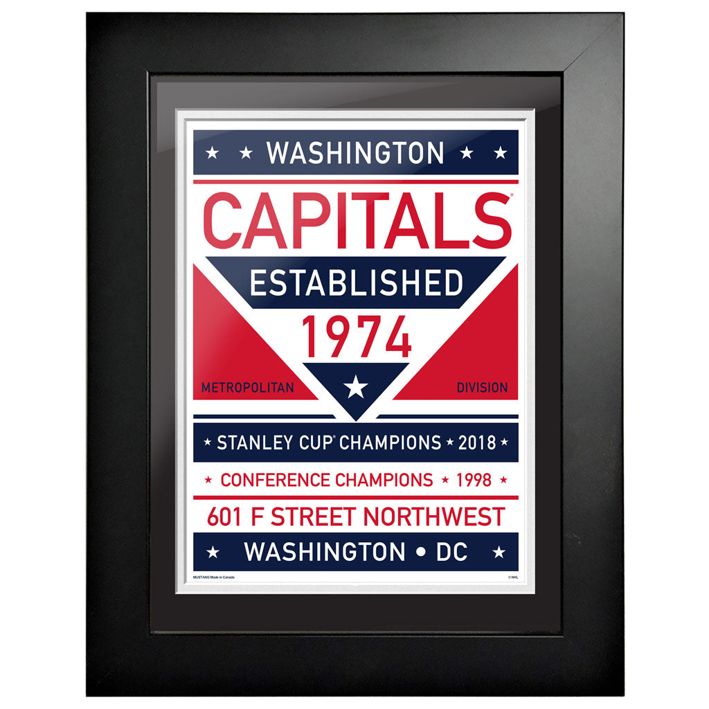 The perfect addition to any hockey Fan Cave, Man Cave, office or bar. This Washington Capitals wall art includes one of our officially licensed NHL graphics, printed and placed into our 12” x 16” framed art kits by our Canadian production team. This fine piece of wall-décor ships with a protective acrylic cover to minimize breakage and increase the lifespan of your product. All framed home décor comes with pre-mounted hanging hardware. Additional mounting hardware may be required.