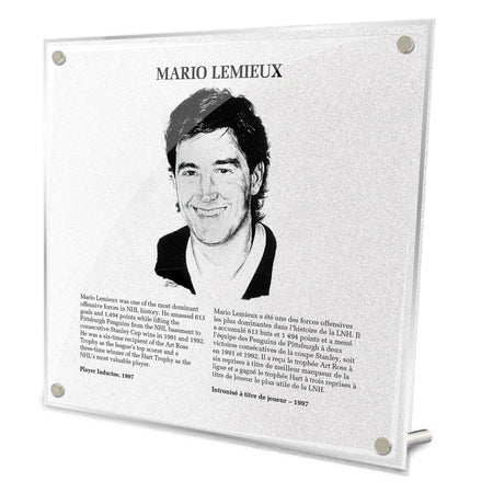 This black & white acrylic plaque features a hand-drawn photo of Lemieux and background history in both English and French. Four chrome-plated pins add both style and function, holding the piece up to display on a table-top. The piece comes in a protective presentation box to minimize breakage and increase the lifespan of your product.