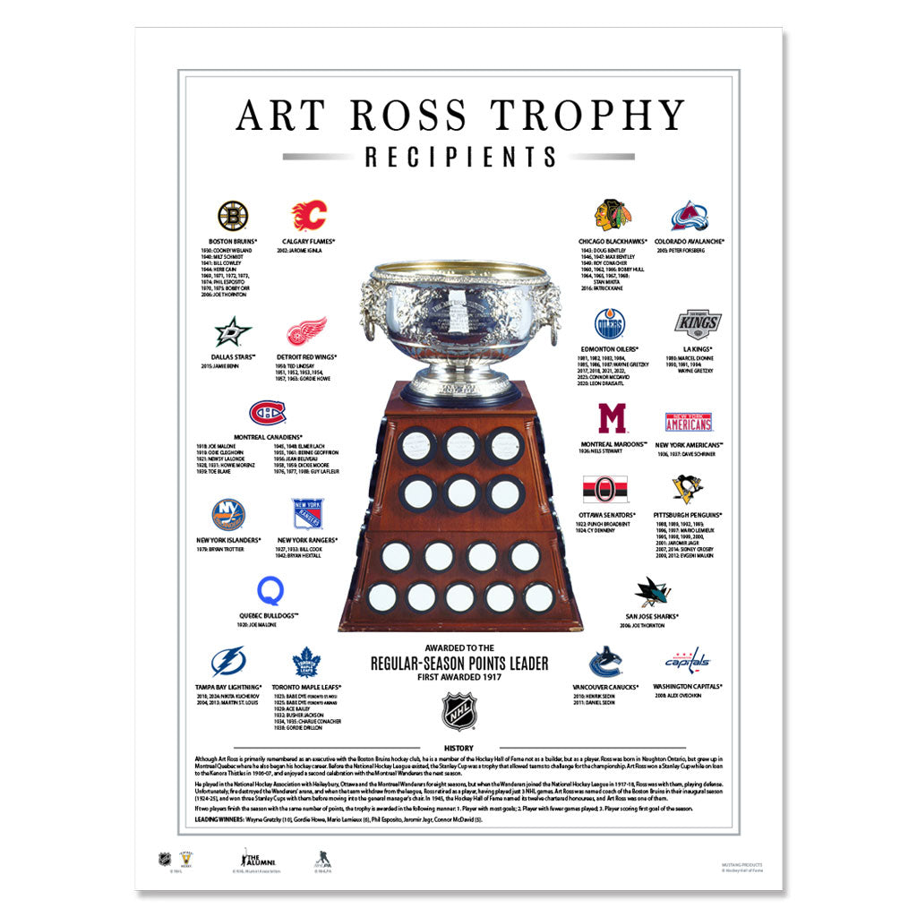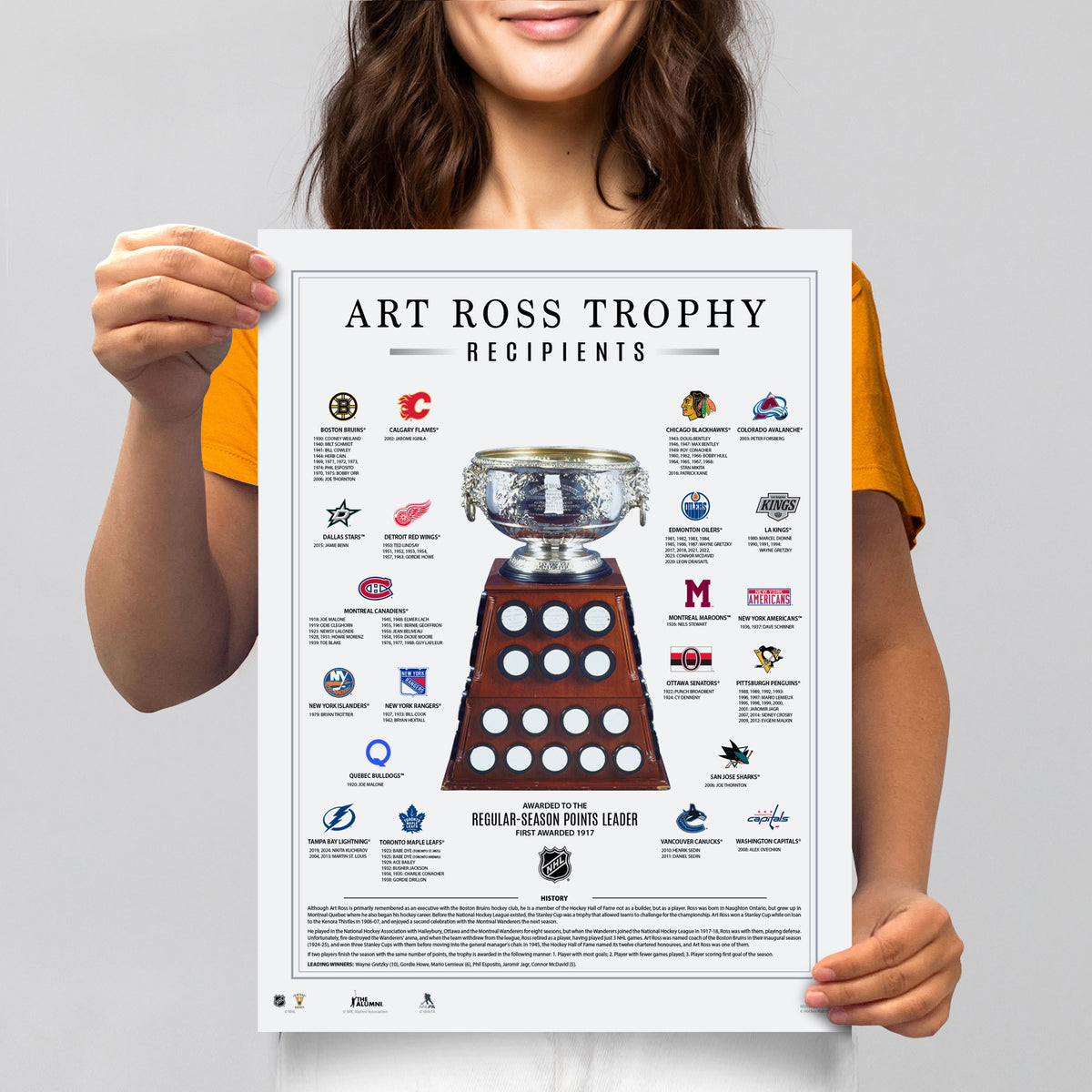 The Art Ross Trophy Print is the perfect addition to your hockey memorabilia collection, providing an image and history about the trophy and its recipients throughout the NHL's history. The image is printed on 12” x 16” poster paper and comes in a cardboard tube, making it easily transportable. Use the print as a solo item, or to fill an empty frame.