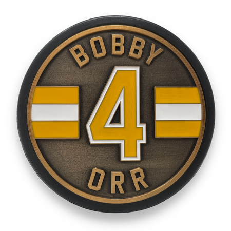 Finished with a vintage antique gold plating that adds a balance of tradition and nostalgia, this work of art celebrates the vibrancy of Orr's career. The beautiful metal work is contrasted with a hand-painted, accented color-filled logo, making this a truly unique addition to your collection.