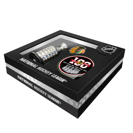 Celebrate the Chicago Blackhawks Centennial year and unforgettable 6 Stanley Cup victories with this officially licensed NHL Collectible Box Set. Perfect for passionate fans and dedicated collectors, this premium set highlights one of the franchise’s greatest achievements in stunning detail.