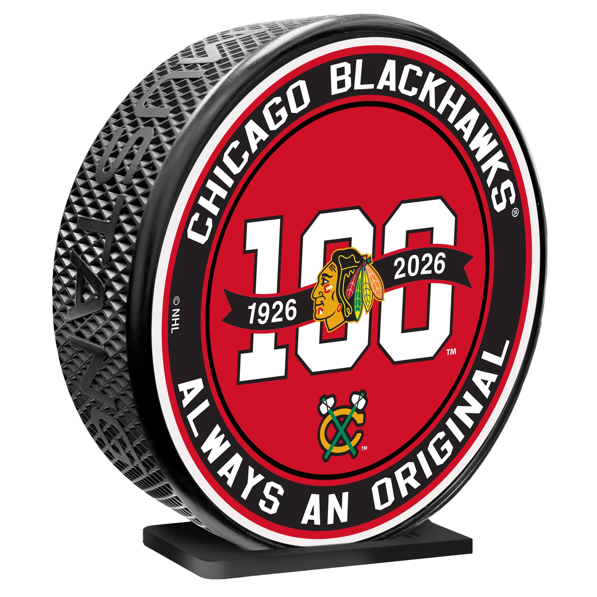Mark the moment with this Chicago Blackhawks 8" Centennial Mega Puck, a bold tribute to the game we love. Oversized and eye-catching, this collectible features the official centennial logo and a durable design perfect for display in your home, office, or fan cave. Whether you’re a lifelong supporter or a new fan of the sport’s legacy, this mega puck makes a statement worthy of 100 years of hockey greatness.