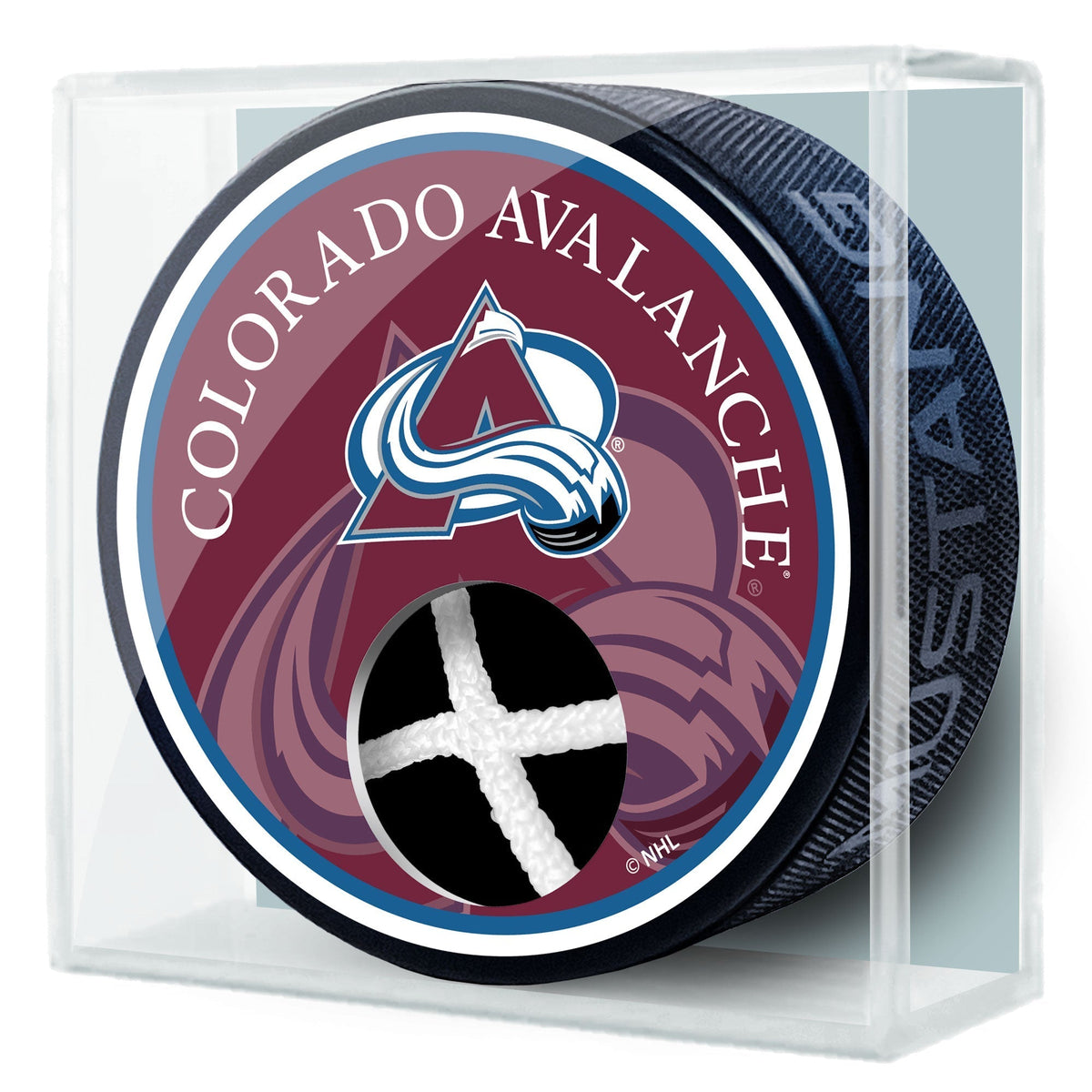 The Game Used Colorado Avalanche Net Puck features a round cut-out that holds an authentic 1” cross section of netting from no particular game, event, or season. The puck design features the team’s name and logo over a team-colored backdrop with an enlarged, faded team logo. The puck includes an acrylic display case, so you can put your piece on full display. The puck comes with an authenticity card certifying that the net is authentic NHL game used netting.