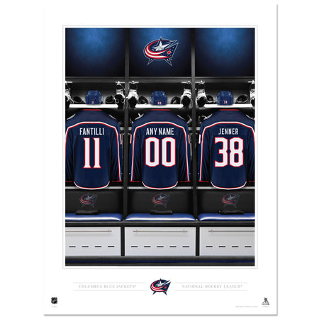 The print features Fantilli and Jenner jerseys hanging in the Blue Jackets locker room, on either side of a custom jersey. Make the piece your own by personalizing the jersey with any name and number. The base of the print includes the team name, logo, and league name. Printed on a textured archival paper, this piece is perfect as a solo item, or to fill an empty frame.