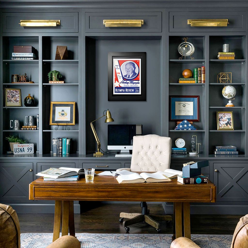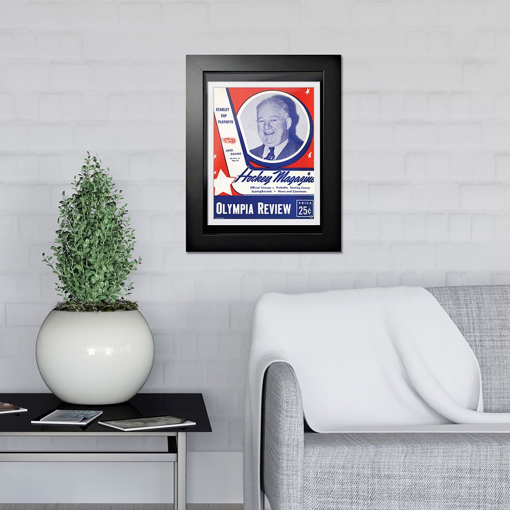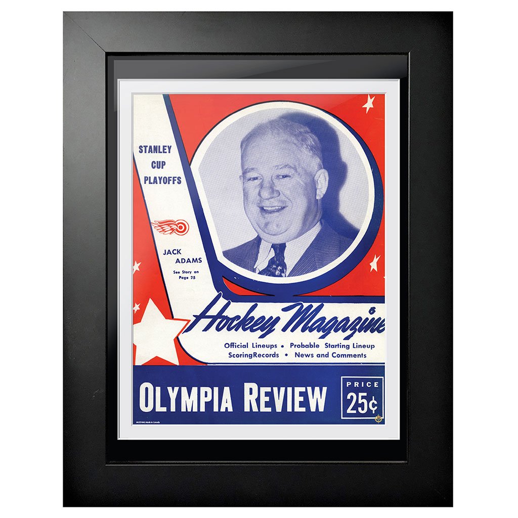 In the early days, long before cell phones and social media, hockey fans would arrive at their arena anxious to buy the latest game program giving them the latest info they needed to follow their favorite team. The advent of digital design and sophisticated photography has dramatically transformed the look and feel of the classic game-night program that captured the attention of fans. As early as the 1920’s, portraits and caricatures captured the scope of what fans would find at the rink. This Red Wings Hockey Magazine cover features legendary coach and General Manager Jack Adams.