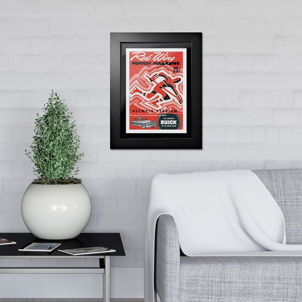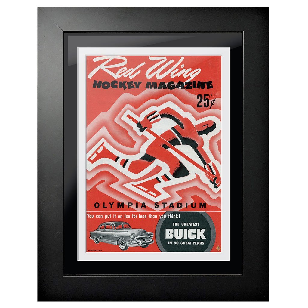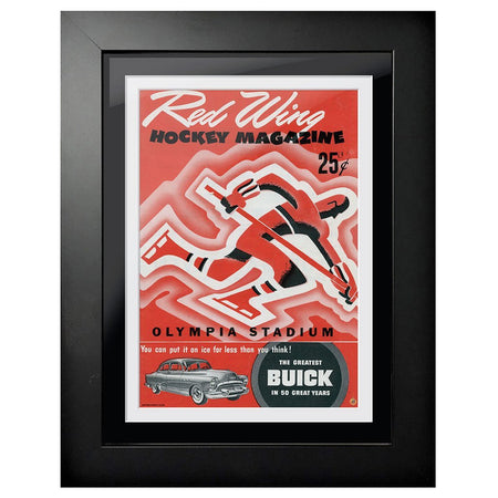 In the early days, long before cell phones and social media, hockey fans would arrive at their arena anxious to buy the latest game program giving them the latest info they needed to follow their favorite team. The advent of digital design and sophisticated photography has dramatically transformed the look and feel of the classic game-night program that captured the attention of fans. As early as the 1920’s, portraits and caricatures captured the scope of what fans would find at the rink. This program is a truly unique Red Wing Magazine with a classic illustration highlights iconic Olympia Stadium.