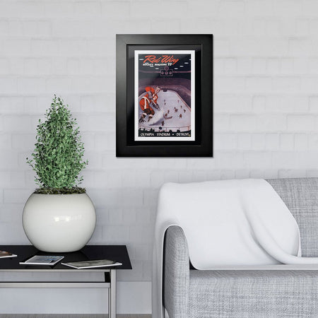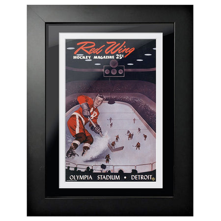 In the early days, long before cell phones and social media, hockey fans would arrive at their arena anxious to buy the latest game program giving them the latest info they needed to follow their favorite team. The advent of digital design and sophisticated photography has dramatically transformed the look and feel of the classic game-night program that captured the attention of fans. As early as the 1920’s, portraits and caricatures captured the scope of what fans would find at the rink. This program is truly unique Red Wing Magazine with a classic cartoon illustration of a player making a hockey stop with iconic Olympia Stadium in the background.