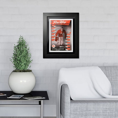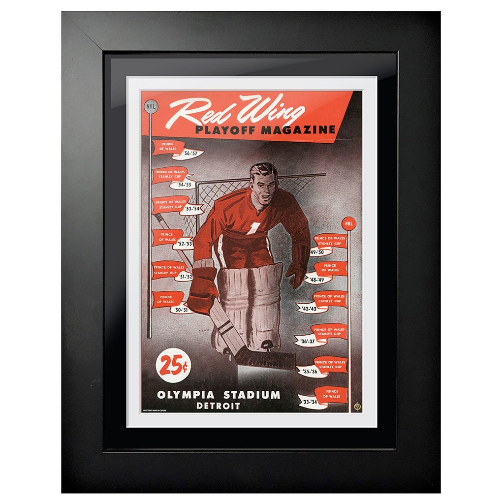 In the early days, long before cell phones and social media, hockey fans would arrive at their arena anxious to buy the latest game program giving them the latest info they needed to follow their favorite team. The advent of digital design and sophisticated photography has dramatically transformed the look and feel of the classic game-night program that captured the attention of fans. As early as the 1920’s, portraits and caricatures captured the scope of what fans would find at the rink. This program is a truly unique Red Wing Magazine Playoff Edition with a classic cartoon illustration features past Prince of Wales and Stanley Cup titles for the 1958 playoff series vs Canadiens, with a caricature of Terry Sawchuk.