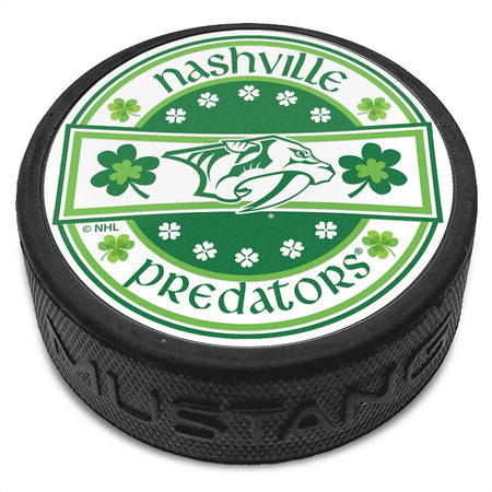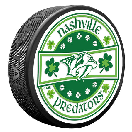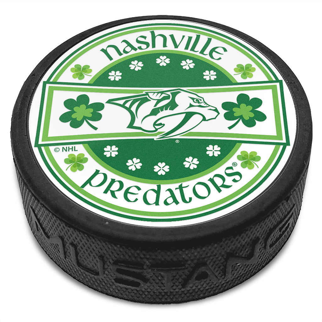 Celebrate St. Patrick’s Day with this St. Patrick’s Day Nashville Predators puck! The puck features the team’s name and logo, as well as a stylish green four-leaf clover design. The 3D engraving adds texture that you won’t find with just a regular printed puck, making this a stand-out in your collection!