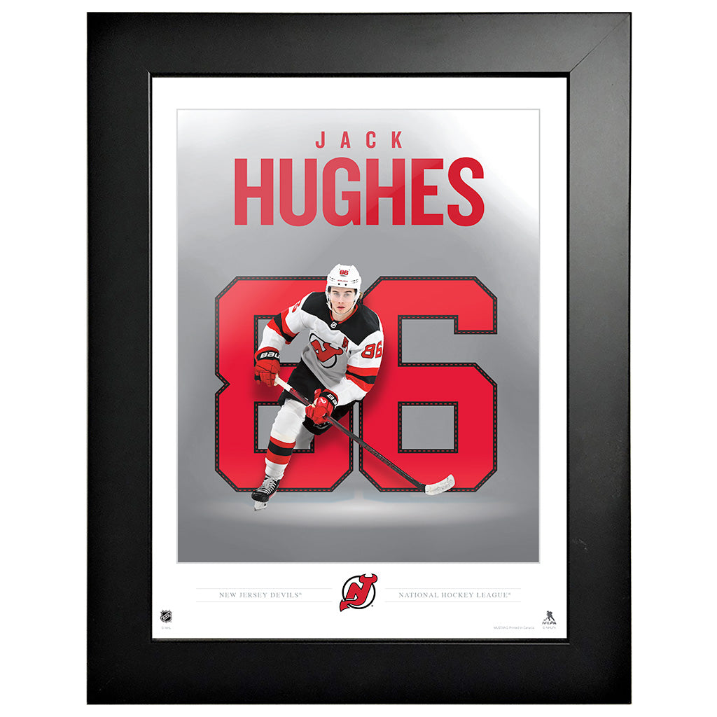 Show off your New Jersey Devils pride with this sleek framed Jack Hughes player print. Featuring bold graphics of Hughes in action alongside his name and number 86, this officially licensed NHL collectible is the perfect addition to any fan cave, office, or game room. The vibrant Devils red lettering and crisp presentation make it a standout piece that highlights your favorite player.