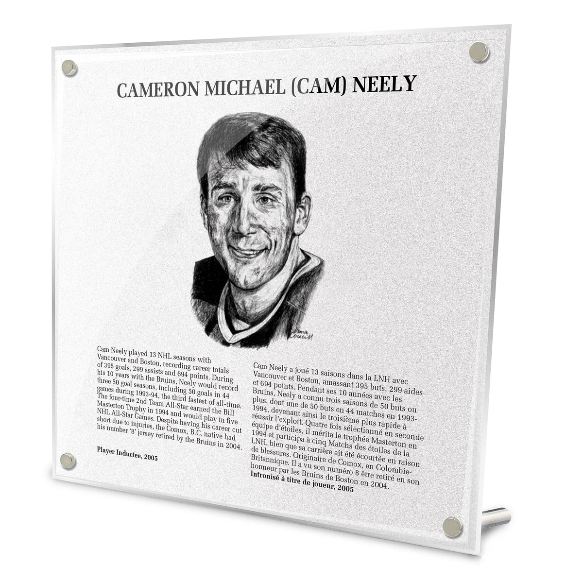 This black & white acrylic plaque features a hand-drawn photo of Roenick and background history in both English and French. Four chrome-plated pins add both style and function, holding the piece up to display on a table-top. The piece comes in a protective presentation box to minimize breakage and increase the lifespan of your product.