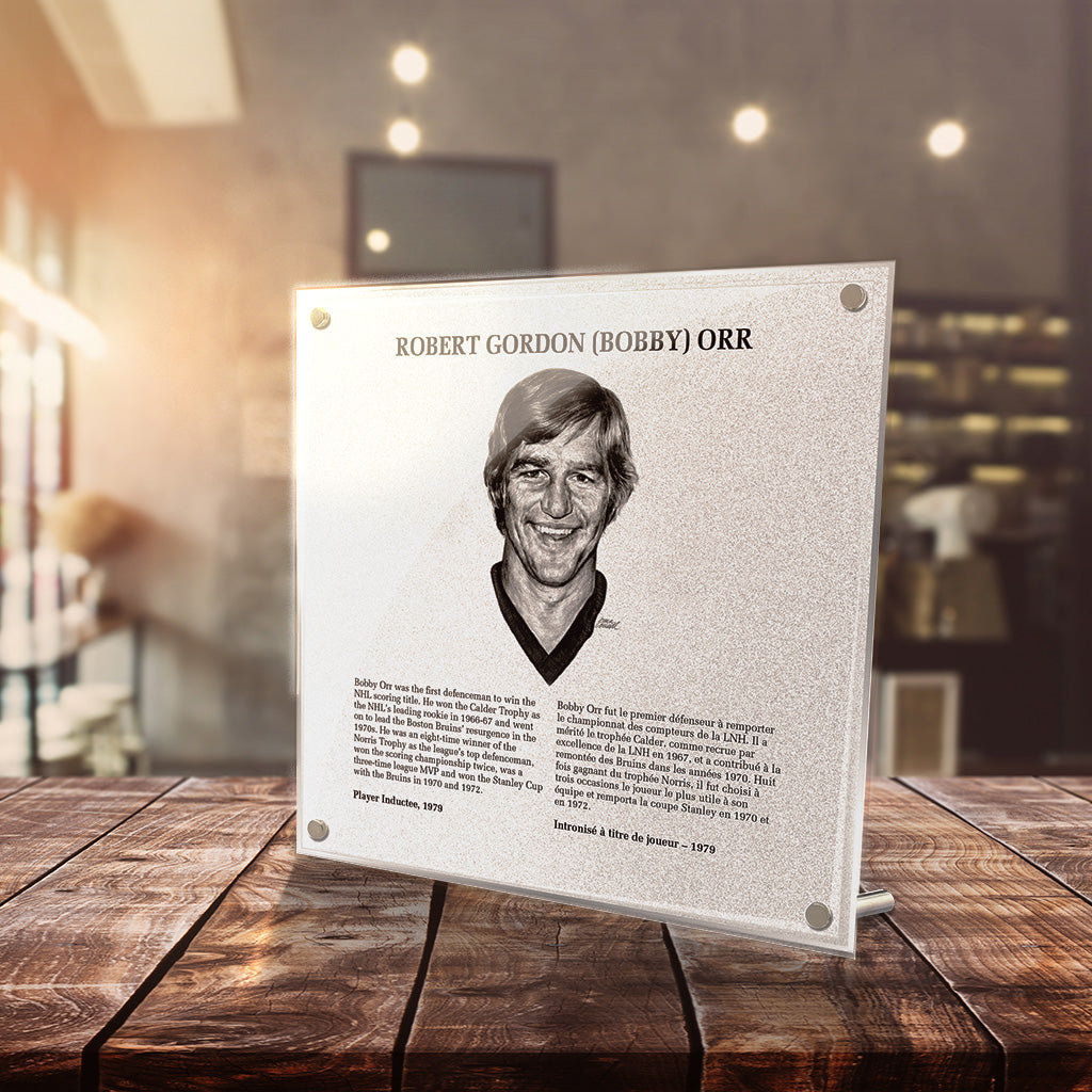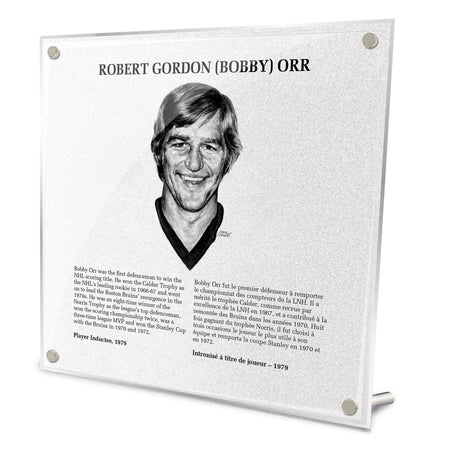 This black & white acrylic plaque features a hand-drawn photo of Orr and background history in both English and French. Four chrome-plated pins add both style and function, holding the piece up to display on a table-top. The piece comes in a protective presentation box to minimize breakage and increase the lifespan of your product.