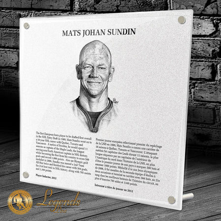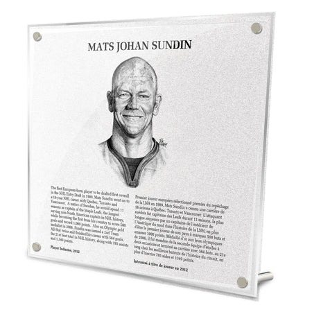 This black & white acrylic plaque features a hand-drawn photo of Sundin and background history in both English and French. Four chrome-plated pins add both style and function, holding the piece up to display on a table-top. The piece comes in a protective presentation box to minimize breakage and increase the lifespan of your product.