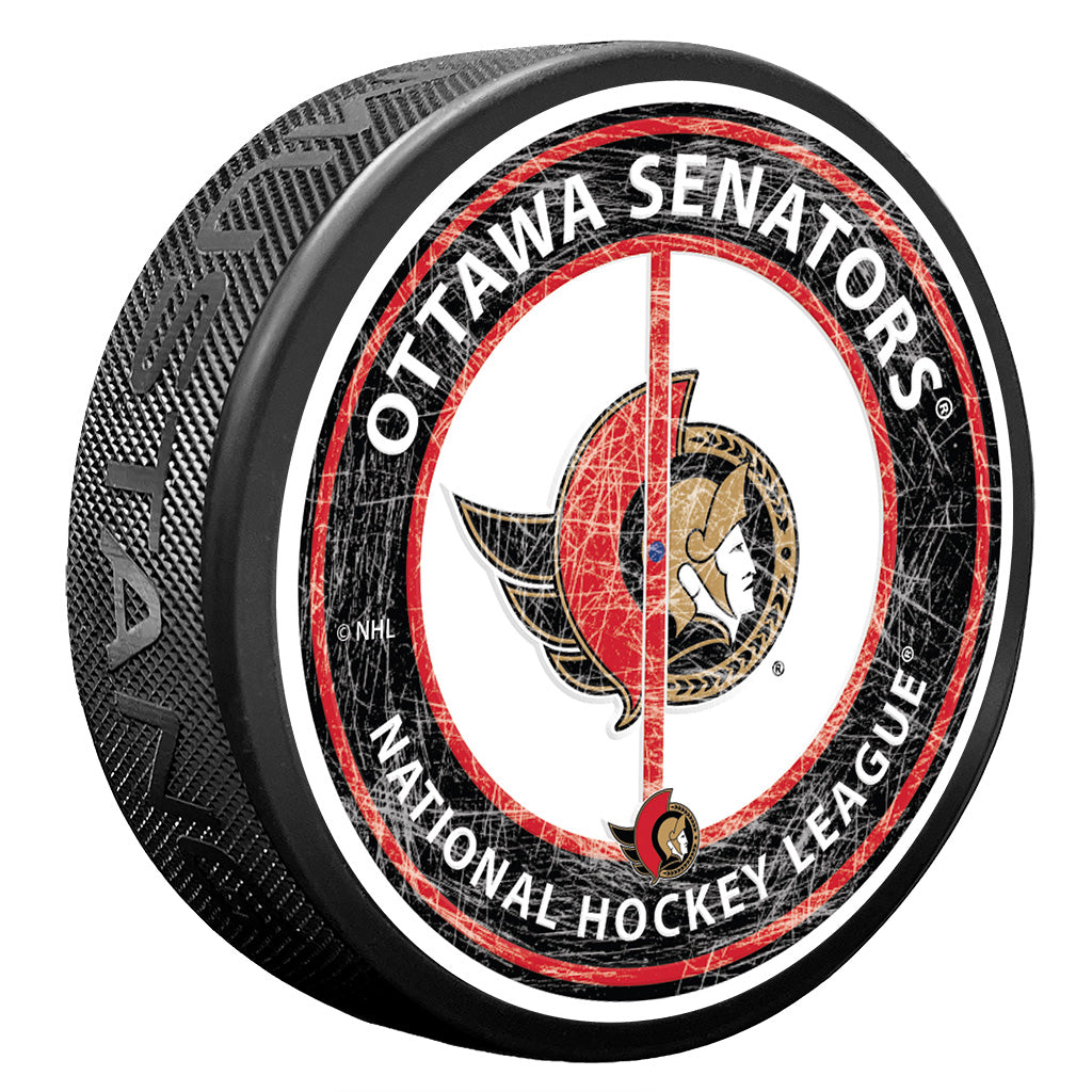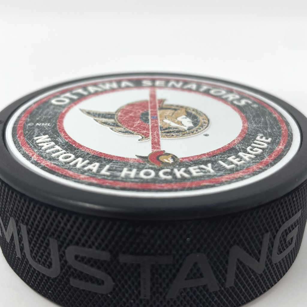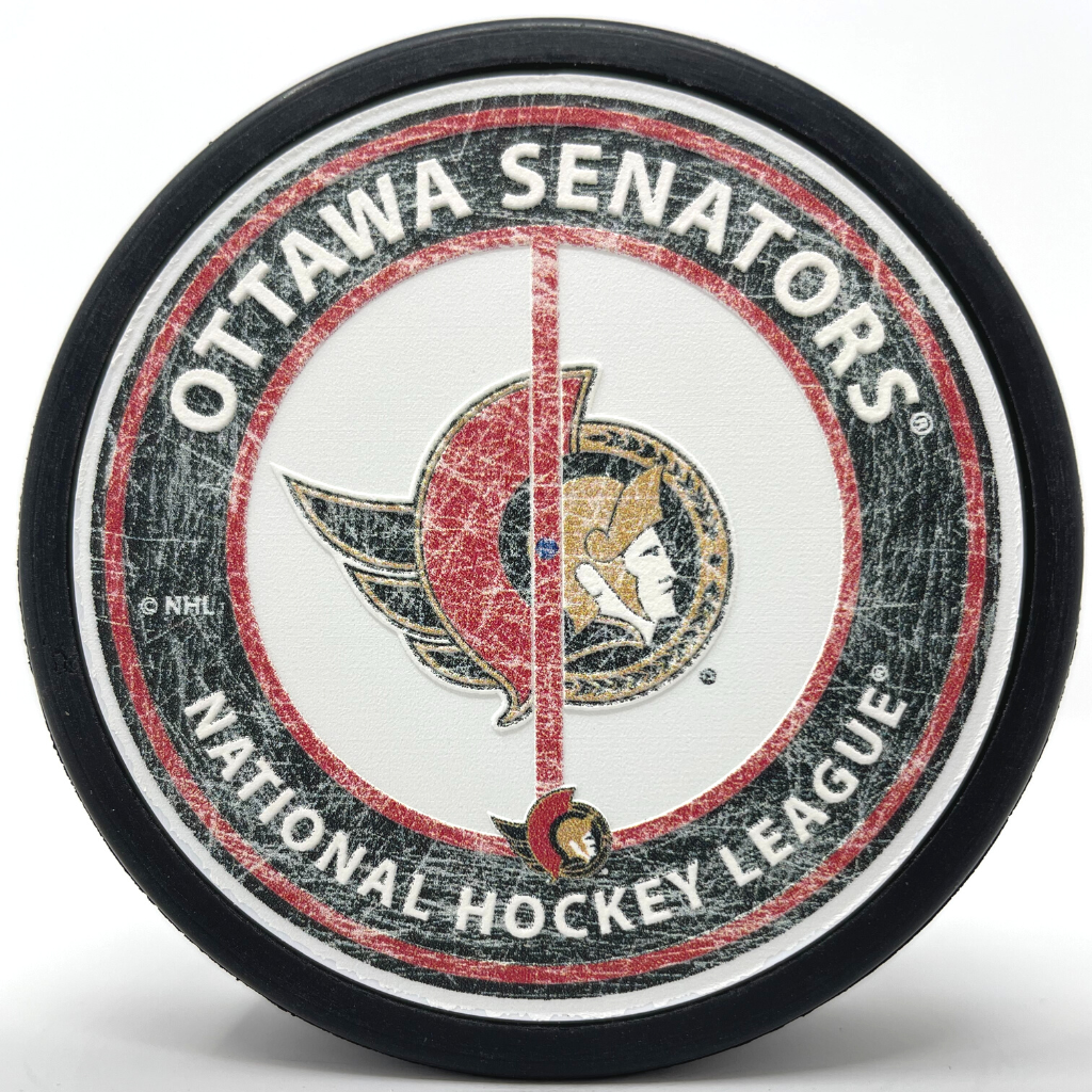 This unique Center Ice Ottawa Senators Puck is designed with the Senators' center ice logo. Look closely and you will see the red line representing center ice. The 3D engraving adds texture that you won’t find with just a regular printed puck, making this a stand-out in your collection!