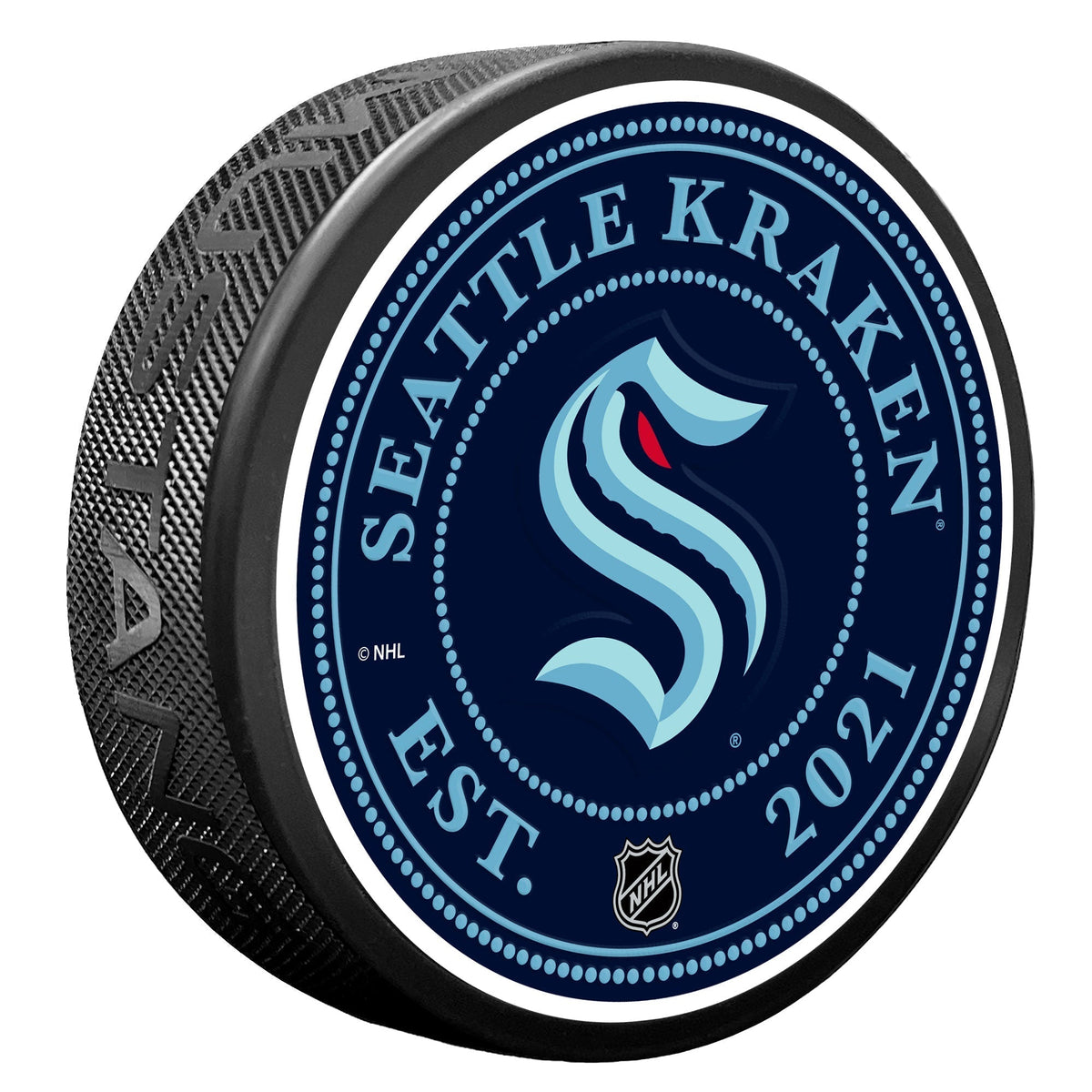 The Stud Seattle Kraken puck features a team-colored backdrop, with the team’s logo, name, and established date enclosed in studs. The 3D engraving adds texture that you won’t find with just a regular printed puck, making this a stand-out in your collection!