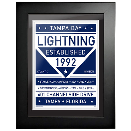 The perfect addition to any hockey Fan Cave, Man Cave, office or bar. This Tampa Bay Lightning wall art includes one of our officially licensed NHL graphics, printed and placed into our 12” x 16” framed art kits by our Canadian production team. This fine piece of wall-décor ships with a protective acrylic cover to minimize breakage and increase the lifespan of your product. All framed home décor comes with pre-mounted hanging hardware. Additional mounting hardware may be required.