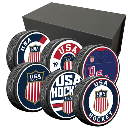 Show your pride for USA Hockey with this premium 6-pack of collectible USA Hockey pucks. Each puck features a bold, USA Hockley inspired design with official logos, set against a classic navy, red, and white colorway. Packaged in a sleek black gift box, this set is perfect for fans, collectors, and anyone who loves the game.