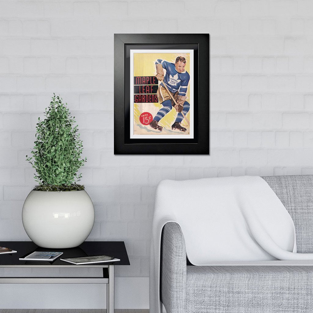 In the early days, long before cell phones and social media, hockey fans would arrive at their arena anxious to buy the latest game program giving them the latest info they needed to follow their favorite team. The advent of digital design and sophisticated photography has dramatically transformed the look and feel of the classic game-night program that captured the attention of fans. As early as the 1920’s, portraits and caricatures captured the scope of what fans would find at the rink. This early Maple Leaf Gardens program cover featured a unique illustration of a Leafs player skating.