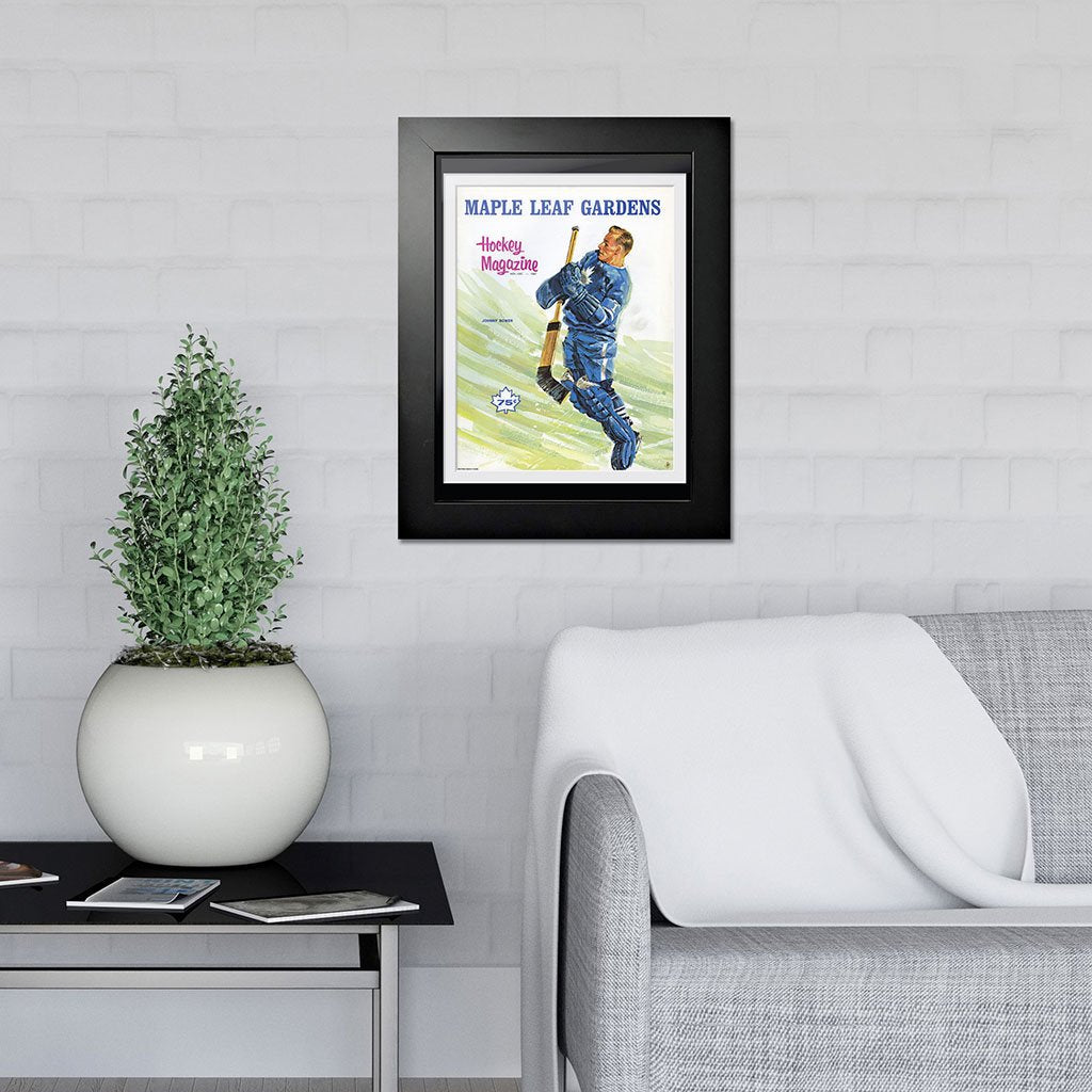 In the early days, long before cell phones and social media, hockey fans would arrive at their arena anxious to buy the latest game program giving them the latest info they needed to follow their favorite team. The advent of digital design and sophisticated photography has dramatically transformed the look and feel of the classic game-night program that captured the attention of fans. As early as the 1920’s, portraits and caricatures captured the scope of what fans would find at the rink. This unique Hockey Magazine program from 1967 shows a unique illustration of Toronto Maple Leaf legend Johnny Bower lifting into the air to make a stop. Notice no helmet to assist in the stop Nicknamed "The China Wall", he who won four Stanley Cups during his career with the Toronto Maple Leafs. In 2017 he was named one of the "100 Greatest NHL Players" in history.