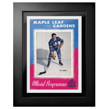 In the early days, long before cell phones and social media, hockey fans would arrive at their arena anxious to buy the latest game program giving them the latest info they needed to follow their favorite team. The advent of digital design and sophisticated photography has dramatically transformed the look and feel of the classic game-night program that captured the attention of fans. As early as the 1920’s, portraits and caricatures captured the scope of what fans would find at the rink. This early Maple Leaf Gardens program cover features Bill Ezinicki. William "Wild Bill" Ezinicki played for the Toronto Maple Leafs from 1944–1950. He was best known as a gritty hard-hitting player. He won three Stanley Cups with the Toronto Maple Leafs in 1947, 1948 and 1949.