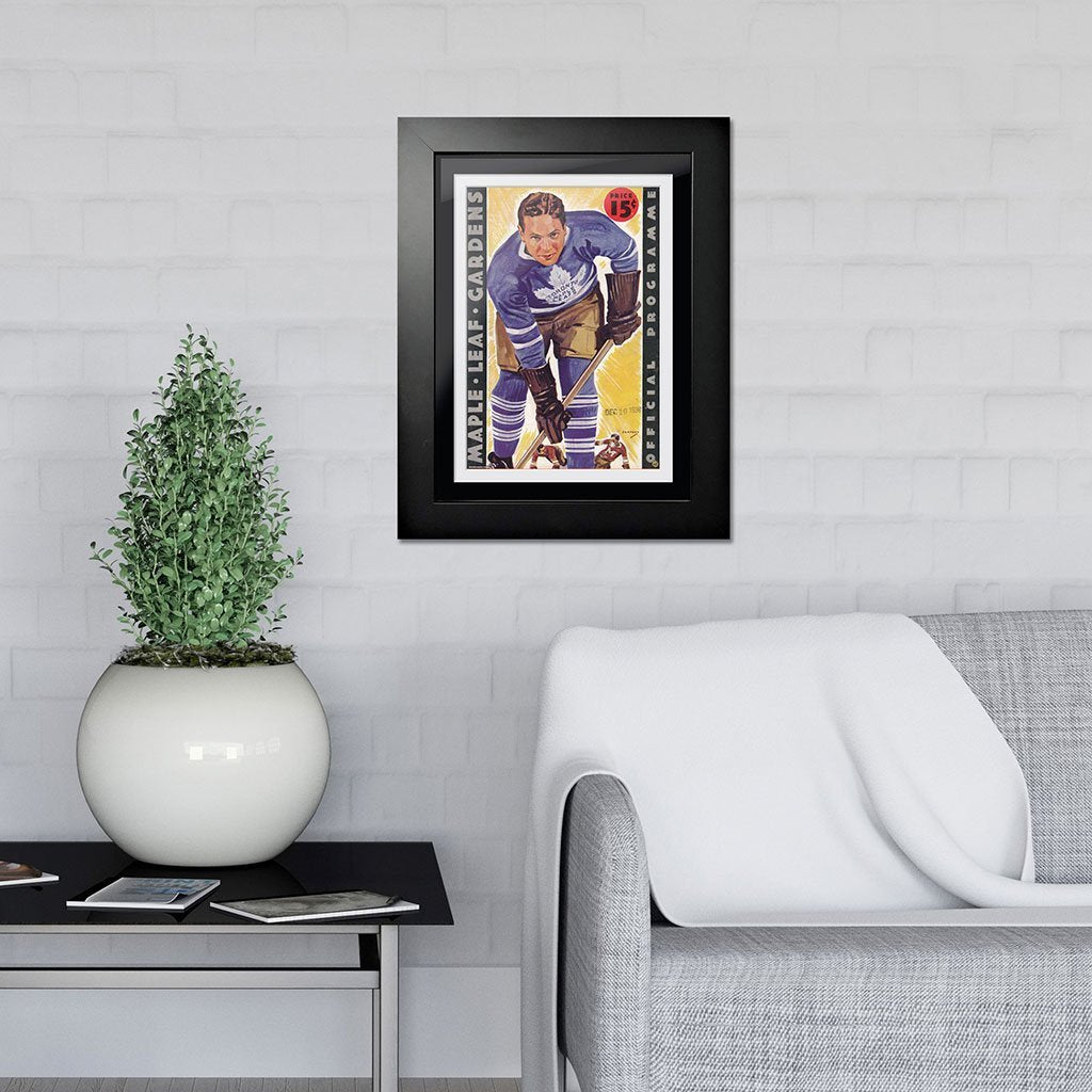 In the early days, long before cell phones and social media, hockey fans would arrive at their arena anxious to buy the latest game program giving them the latest info they needed to follow their favorite team. The advent of digital design and sophisticated photography has dramatically transformed the look and feel of the classic game-night program that captured the attention of fans. As early as the 1920’s, portraits and caricatures captured the scope of what fans would find at the rink. This early Maple Leaf Gardens program cover from 1938 featured a unique illustration of a Leafs player skating.