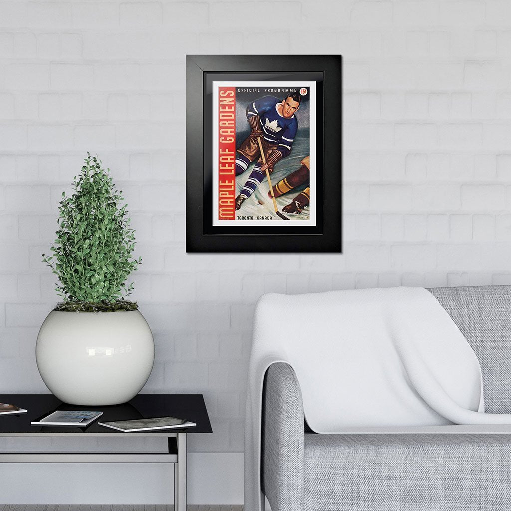 In the early days, long before cell phones and social media, hockey fans would arrive at their arena anxious to buy the latest game program giving them the latest info they needed to follow their favorite team. The advent of digital design and sophisticated photography has dramatically transformed the look and feel of the classic game-night program that captured the attention of fans. As early as the 1920’s, portraits and caricatures captured the scope of what fans would find at the rink. This early Maple Leaf Gardens program cover featured a unique illustration of a Leafs player skating.