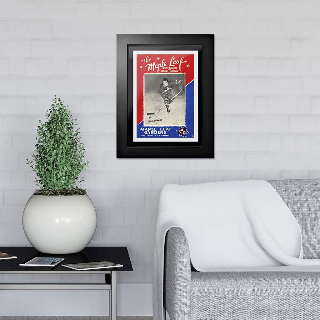 In the early days, long before cell phones and social media, hockey fans would arrive at their arena anxious to buy the latest game program giving them the latest info they needed to follow their favorite team. The advent of digital design and sophisticated photography has dramatically transformed the look and feel of the classic game-night program that captured the attention of fans. As early as the 1920’s, portraits and caricatures captured the scope of what fans would find at the rink. This early Maple Leaf Gardens program cover features Bill Barilko. During his time the Toronto Maple Leafs were Stanley Cup champions on four occasions: 1947, 1948, 1949, 1951.[5] The last goal scored by Barilko was in overtime against the Montreal Canadiens' netminder Gerry McNeil. This goal, in Game 5 of the 1951 Stanley Cup Final (April 21, 1951) won the Leafs the Cup.