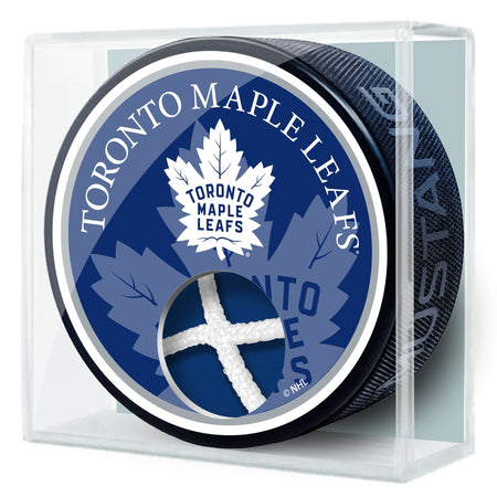 The Game Used Toronto Maple Leafs Net Puck features a round cut-out that holds an authentic 1” cross section of netting from no particular game, event, or season. The puck design features the team’s name and logo over a team-colored backdrop with an enlarged, faded team logo. The puck includes an acrylic display case, so you can put your piece on full display. The puck comes with an authenticity card certifying that the net is authentic NHL game used netting.