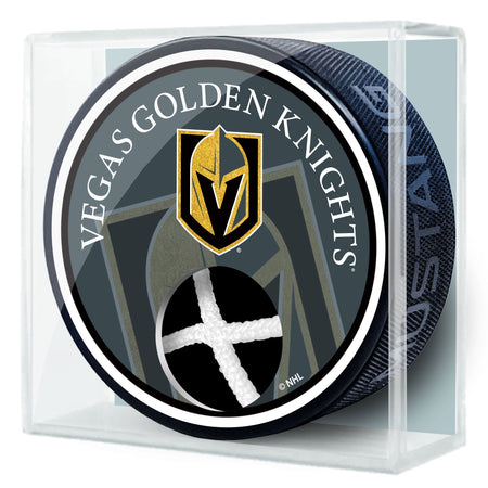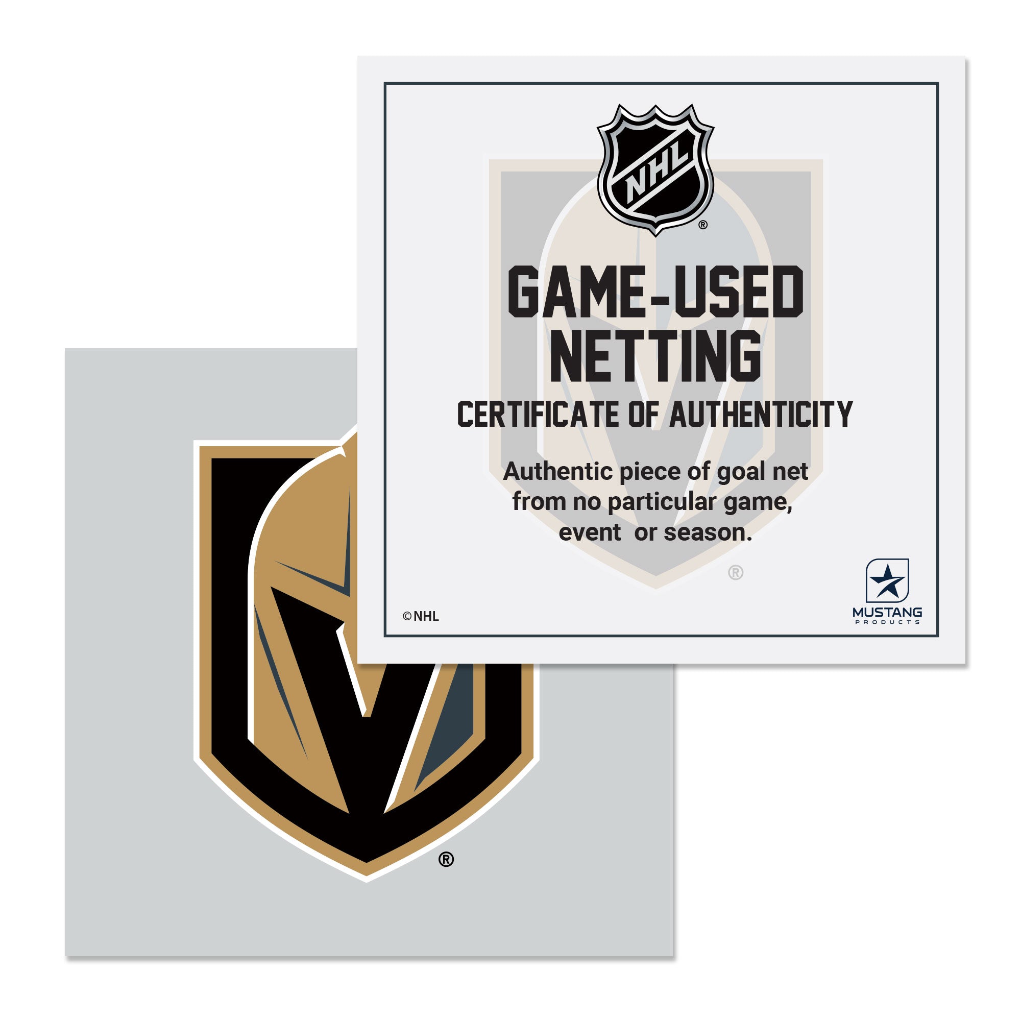 The Game Used Vegas Golden Knights Net Puck features a round cut-out that holds an authentic 1” cross section of netting from no particular game, event, or season. The puck design features the team’s name and logo over a team-colored backdrop with an enlarged, faded team logo. The puck includes an acrylic display case, so you can put your piece on full display. The puck comes with an authenticity card certifying that the net is authentic NHL game used netting.