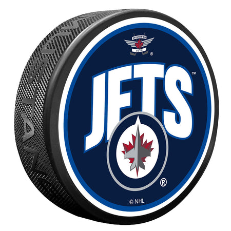 Get loud and proud with the Wordmark Winnipeg Jets Puck! This stylish puck boasts a bold wordmark of the team’s name, logo, and retro logo against a team-colored backdrop. The 3D engraving adds texture that you won’t find with just a regular printed puck, making this a stand-out in your collection!